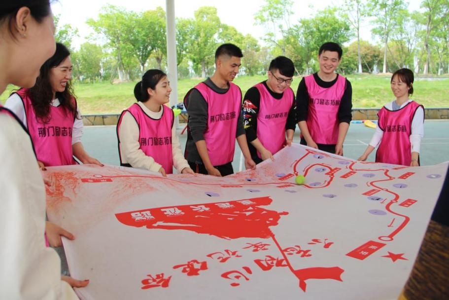 在整個(gè)拓展活動(dòng)中,有時(shí)看似簡(jiǎn)單的一個(gè)個(gè)小游戲,完成起來(lái)卻并不容易?!肮奈枞诵摹表?xiàng)目中,十六個(gè)人步伐要統(tǒng)一協(xié)調(diào),移動(dòng)過(guò)程中還要保證鼓面的平衡,在球落在鼓面之上時(shí)更要把握一定的力度,使得球可以彈起又不至于偏的太遠(yuǎn)、彈的過(guò)高。在“重走長(zhǎng)征路”環(huán)節(jié),雖然只是模擬游戲,但卻需要充分了解掌握重要?dú)v史事件,才能突破層層關(guān)卡,獲得成功。在雙方隊(duì)長(zhǎng)的帶領(lǐng)下,雙方隊(duì)員緊密配合,齊心協(xié)力,挑戰(zhàn)自我,從最初的毫無(wú)頭緒到之后的集思廣益,逐步找到方法和竅門,讓團(tuán)隊(duì)的力量和智慧展現(xiàn)的淋漓盡致。