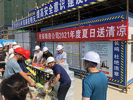 一是“夏日送清涼”慰問活動。7月15日上午,公司領導率隊到荊翰苑項目工地,看望慰問了戰(zhàn)高溫、斗酷暑,堅守崗位的一線施工人員,為他們送去西瓜、礦泉水、藿香正氣液等防暑降溫物資,表達了敬意和謝意。并叮囑他們合理調整作息時間,避開高溫時段作業(yè),注意防暑降溫,注重安全防范,保障身體健康和施工安全。