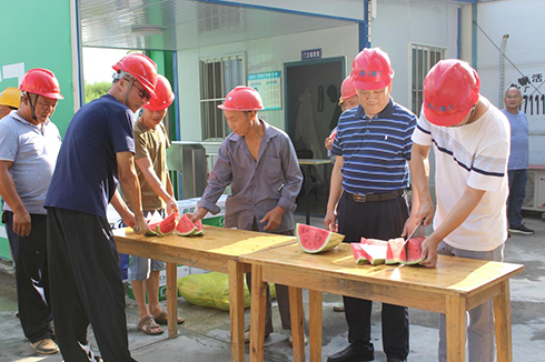 “大家都休息一下 ,來吃塊西瓜解解渴!”在施工現(xiàn)場,慰問小組大聲吆喝道,并把切好的西瓜分發(fā)到作業(yè)人員手中,對他們的辛勤付出表示感謝,并叮囑他們越是高溫極端天氣越要注重個人安全防護(hù),戴好安全帽、系好安全帶,確保高溫期間的安全生產(chǎn)。