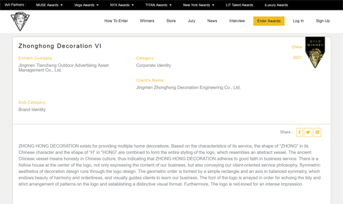 近期,2021年度Muse國(guó)際創(chuàng)意獎(jiǎng)(Muse Creative Awards)公布獲獎(jiǎng)名單,由市城控集團(tuán)所屬子公司市天城廣告公司副總經(jīng)理孫德華設(shè)計(jì)的中鴻裝飾(中荊集團(tuán)全資子公司)VI作品榮獲2021年度Muse國(guó)際創(chuàng)意獎(jiǎng)金獎(jiǎng)。