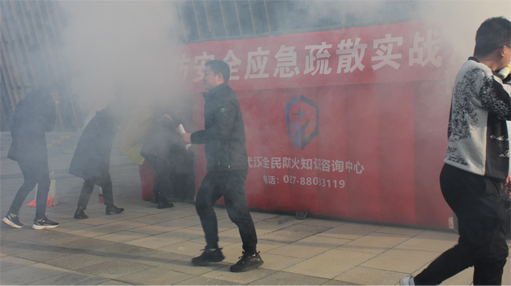 專業(yè)培訓后,全體參訓員工在室外廣場正式拉開消防安全應急疏散實戰(zhàn)演練。面對用煙霧彈模擬的突發(fā)火災的演練屋,大家用濕毛巾、濕手帕或衣袖捂住口鼻,低姿前進,快速穿過預定疏散線路,有序撤離到廣場安全區(qū)域。