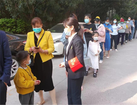 很快檢測點前就排起了長隊,此時的物業(yè)工作人員顧不上渾身疲憊,又馬不停蹄地全力維持現(xiàn)場秩序,引導(dǎo)業(yè)主保持一米距離,并提醒大家提前出示健康碼,面對小區(qū)內(nèi)老年人不會使用手機的情況,工作人員一一耐心進行指導(dǎo)操作。在物業(yè)工作人員的不懈努力下,現(xiàn)場秩序井然,確保了核酸采樣工作快速、高效、有序地開展。盡管忙碌了一上午,他們卻沒有人喊過一聲苦,叫過一聲累,以實際行動履行了城控物業(yè)人的責任擔當。