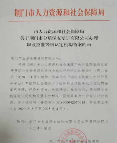 近日,金盾培訓(xùn)公司成功獲批省級(jí)社會(huì)培訓(xùn)評(píng)價(jià)組織職業(yè)技能等級(jí)認(rèn)定機(jī)構(gòu)并正式掛牌,公司將可面向社會(huì)開展“保衛(wèi)管理員”職業(yè)技能等級(jí)培訓(xùn)及考核評(píng)定,并頒發(fā)國(guó)家認(rèn)可的等級(jí)證書。