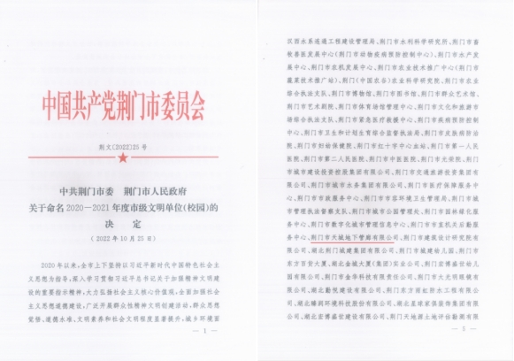 近日,荊門市委、市政府印發(fā)《關(guān)于命名2020-2021年度市級(jí)文明單位(校園)的決定》,荊門市天城地下管廊有限公司被授予“文明單位”榮譽(yù)稱號(hào)。