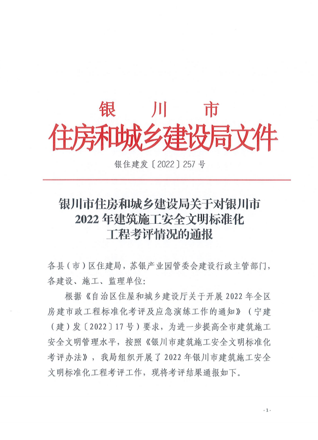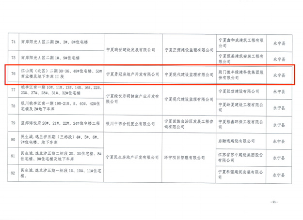 2022年11月,銀川市住建局組織開展了2022年銀川市建筑施工安全文明標(biāo)準(zhǔn)化工程考評(píng)工作。寧夏勇冠房地產(chǎn)開發(fā)有限公司開發(fā)建設(shè)的江山閱(北區(qū))二期30-36、48#住宅樓、50#商業(yè)樓及地下車庫(kù)Ⅱ段工程被授予“建筑施工安全文明標(biāo)準(zhǔn)化工程”稱號(hào)。