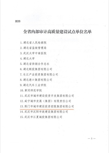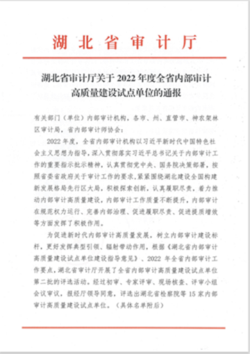 近期,湖北省審計(jì)廳發(fā)布《湖北省審計(jì)廳關(guān)于2022年度全省內(nèi)部審計(jì)高質(zhì)量建設(shè)試點(diǎn)單位的通報(bào)》,荊門(mén)城控集團(tuán)被成功評(píng)為湖北省內(nèi)部審計(jì)高質(zhì)量建設(shè)試點(diǎn)單位。