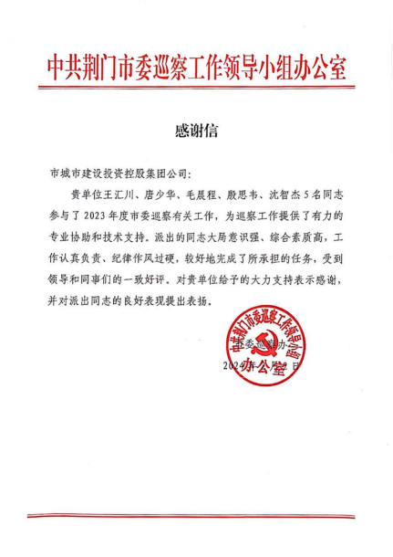 近日,集團(tuán)收到市委巡察辦發(fā)來(lái)的感謝信,在2023年度市委巡察相關(guān)工作期間,王匯川、唐少華、毛晨程、殷思韋、沈智杰5名同志為巡察工作提供了有力的專(zhuān)業(yè)協(xié)助和技術(shù)支持。來(lái)信對(duì)以上同志的大局意識(shí)、綜合素質(zhì)、辦事態(tài)度、紀(jì)律作風(fēng)等方面給予了充分肯定。