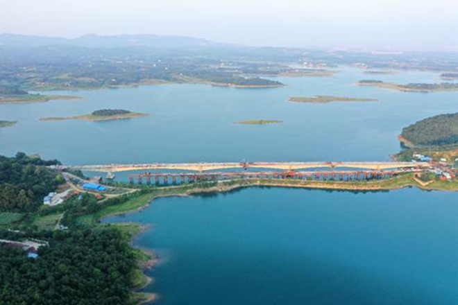 漳河環(huán)庫(kù)防汛公路由荊門市城市建設(shè)投資有限公司投資建設(shè),全長(zhǎng)60.4公里。項(xiàng)目共含十座橋梁,其中共有4座大橋關(guān)鍵性節(jié)點(diǎn)工程,道子河大橋是其中最大的一座,于2017年1月動(dòng)工建設(shè),全長(zhǎng)560.57米,橋面寬度13.5米,130米大跨徑,有效增加過水面積。道子河大橋于中跨順利合龍后,隨后將進(jìn)行橋面鋪裝、護(hù)欄架設(shè)等工作,預(yù)計(jì)2019年底可投入使用,不僅能保證車輛與人員的通行功能、改善道子河兩岸交通不暢的現(xiàn)狀,還能最大程度地保護(hù)漳河水庫(kù)自然景觀與生態(tài)環(huán)境。