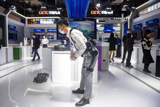 在浙江烏鎮(zhèn)舉辦的2022年“互聯(lián)網(wǎng)之光”博覽會(huì)上,中國電科工作人員為觀眾演示外骨骼機(jī)器人的使用(2022年11月8日攝)。