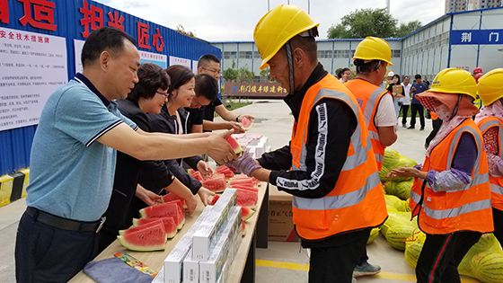 隨后,調(diào)研慰問組一行頂著炎炎烈日在項目現(xiàn)場開展送清涼活動,將西瓜、飲料、防暑藥品等慰問物資送到施工人員手中,面對酷暑,一線人員“搶時間,趕進(jìn)度”,強光下個個曬得黝黑。咫尺貼心的問候,帶給千里之外項目干部職工潤徹心田的慰藉,激發(fā)了必勝的豪情。銀川團隊及參建各方紛紛表示,有決心有信心,用汗水和業(yè)績?yōu)槭谐强丶瘓F在祖國大西北凝鑄閃亮的金字招牌,為集團“走出去”戰(zhàn)略打下堅實的基礎(chǔ)。(文:代加燈 李曉旭;圖:趙鋒)