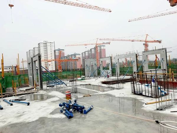 第一批裝配式建筑預(yù)制構(gòu)件主要包括外墻、樓梯、陽臺、隔板等,總計約8900立方米。經(jīng)現(xiàn)場實測,一個小時可完成3片外墻構(gòu)件吊裝,每片外墻構(gòu)件5個平方米,1個立方米,約2噸半左右。4-5天可以完成一層裝配式建筑構(gòu)件安裝和現(xiàn)澆工作。采取裝配式建筑較傳統(tǒng)施工的工期將提升20-30%。