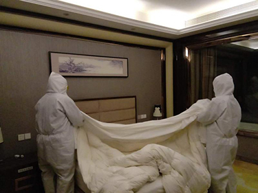 城控凱瑞國際酒店工作人員身著防護服,清掃留觀人員房間